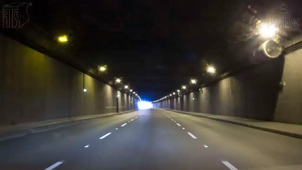 Czy w tej sytuacji możesz jechać na wprost dowolnym pasem ruchu, gdy w tunelu nie ma innych pojazdów?
