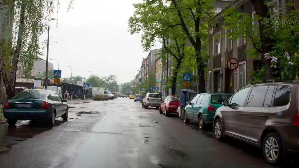 Czy w tej sytuacji, jadąc na wprost, musisz mieć stale włączony lewy kierunkowskaz, ponieważ omijasz zaparkowane pojazdy?