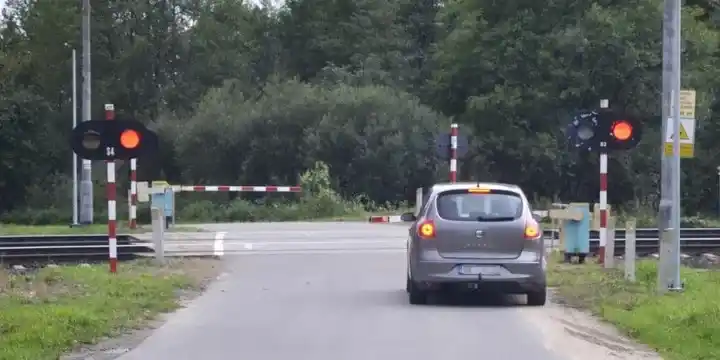 Haben Sie in dieser Situation das Recht, das vorausfahrende Fahrzeug auszuweichen, indem Sie auf den für die Gegenrichtung vorgesehenen Straßenabschnitt einfahren, wenn Sie es schaffen, vor dem Bahnübergang anzuhalten?