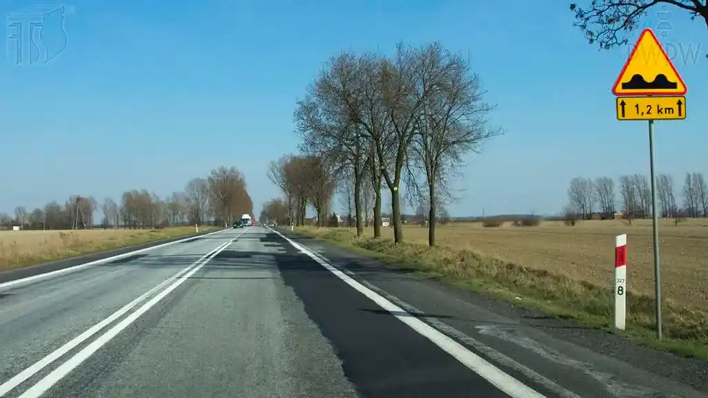Czy w przedstawionej sytuacji jesteś ostrzegany o nierównościach na drodze, występujących na odcinku 1,2 km za znakiem?