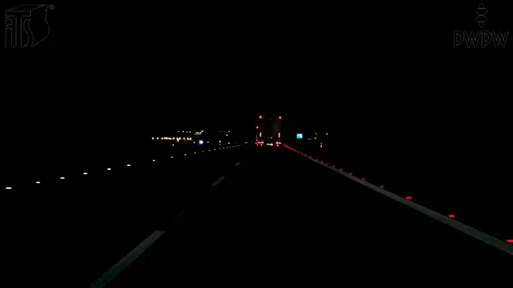 Czy w tej sytuacji czerwone punktowe elementy odblaskowe wyznaczają prawą krawędź jezdni?